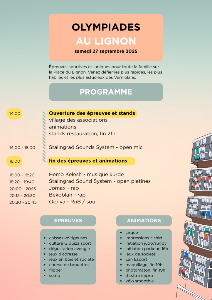 Venez participer à une journée de rencontres, de jeux, de sport et de culture, ouverte à toutes et tous. De 0 à 107 ans, il y en aura pour tous les goûts : parcours d’épreuves sportives gratuites, chaque participant pourra récolter des tampons pour sa participation et obtenir une impression exclusive sur un t-shirt apporté ; animations variées ; espace musical et culturel ; petite restauration et village des associations : APM, Asso parents d’élèves, Jeunesse de Vernier, Contrat de quartier, Intérêts Lignon, Involve, Denise Rauss Raconte-moi ton Lignon, projet Mont-Blanc.