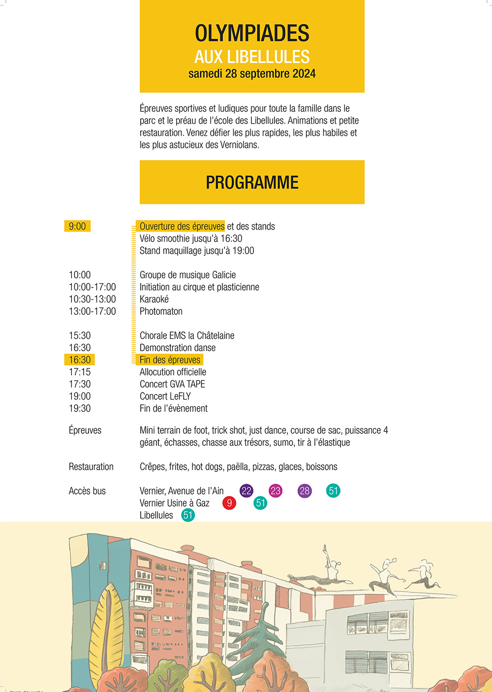 Venez participer à une journée de rencontres, de jeux, de sport et de culture, ouverte à toutes et tous. De 0 à 107 ans, il y en aura pour tous les goûts : parcours d’épreuves sportives gratuites, chaque participant pourra récolter des tampons pour sa participation et obtenir une impression exclusive sur un t-shirt apporté ; animations variées ; espace musical et culturel ; petite restauration et village des associations : APM, Asso parents d’élèves, Jeunesse de Vernier, Contrat de quartier, Intérêts Lignon, Involve, Denise Rauss Raconte-moi ton Lignon, projet Mont-Blanc.